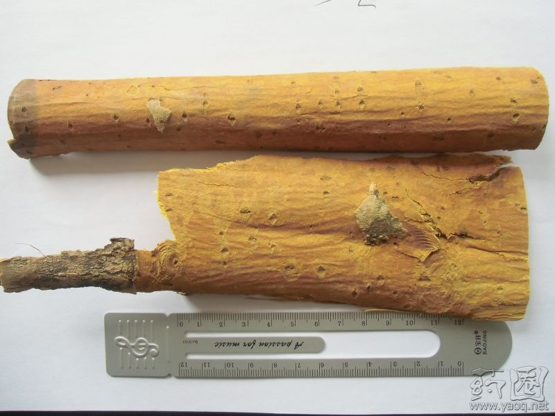 黃柏(2015年版《中國(guó)藥典》)為蕓香科植物黃皮樹(shù)Phellodendron chinense Schneid.的干燥樹(shù)皮。習(xí)稱(chēng)“川黃柏”。剝?nèi)?shù)皮后,除去粗皮,曬干。《神農(nóng)本草經(jīng)》講“氣味苦寒,無(wú)毒。主五臟腸胃中結(jié)熱,黃膽,腸痔,止泄痢,女子漏下赤白,陰傷蝕瘡。”