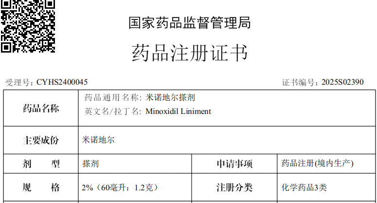 2025年7月30日,合肥華威藥業(yè)收到國(guó)家藥品監(jiān)督管理局核準(zhǔn)簽發(fā)的米諾地爾搽劑《藥品注冊(cè)證書》,批準(zhǔn)我司按照化藥3類申報(bào)的米諾地爾搽劑2%(60ml:1.2g)和5%(60ml:3.0g)兩個(gè)規(guī)格上市,批準(zhǔn)文號(hào)為:國(guó)藥準(zhǔn)字H20255037、H20255038,本次獲批產(chǎn)品已獲得OTC認(rèn)可,可自行評(píng)估,直接在藥店購(gòu)買。
