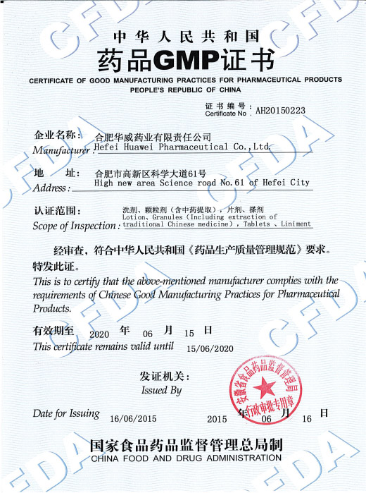 合肥華威藥業(yè)有限責(zé)任公司已通過國家新版GMP認(rèn)證現(xiàn)場檢查,于2015年6月16日獲頒新版GMP證書。取得新證證書編號為:AH20150223;認(rèn)證范圍是洗劑、顆粒劑(含中藥提?。?,片劑、搽劑;證書有效期至2020年6月15日。